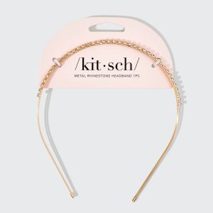Keep your hair in place and elevate your look with this updated take on a Y2K classic ?? the Kitsch Metal Rhinestone Double Headband. This gold. double-band headband features a lightweight metal design to create slicked back looks with ease and sparkling rhinestones to upgrade any look.